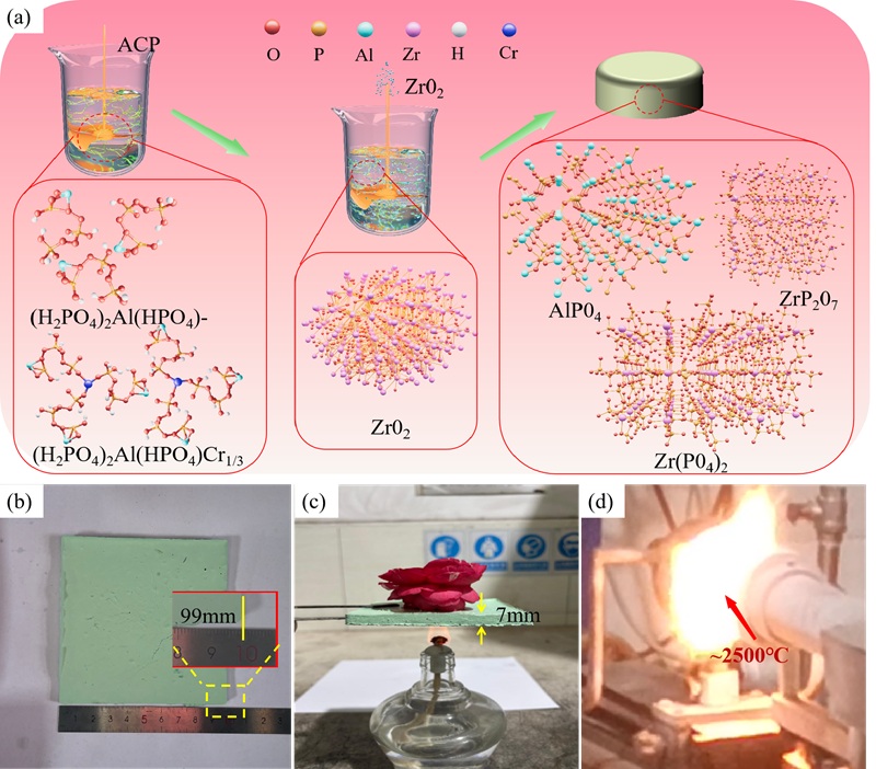 The development of new ablation-resistant and heat-insulating integrated materials for thermal protection of hypersonic vehicles is extremely important, but significant challenges remain. In this study, zirconium-based phosphate ceramics were developed by mixing a nano powder of the traditional ultra-high temperature ceramic oxidation product ZrO2, which has excellent thermal insulation performance, with an aluminum–chromium phosphate slurry, which provides a certain degree of thermal stability. The zirconium-based phosphate ceramics crosslinked and cured by a polycondensation reaction inherited the high temperature resistance of ZrO2 and the low thermal conductivity of the phosphate material, and simultaneously achieving excellent thermal stability, mechanical properties, and the desired properties. The mass ablation rate and line ablation rate of the zirconium-based phosphate ceramics were found to be 0.0173 g/s and 0.0114 mm/s, respectively, under oxyacetylene flame ablation at 2527°C for 30 s. In addition, cooling by up to 2301℃ was achieved over a distance of 10 mm in the thickness direction was achieved. The zirconium-based phosphate ceramics also exhibited remarkable compressive strength (6.23–29.22 MPa), good thermal insulation (0.827–1.784 W/m·K), excellent thermal stability, and mass loss within 2.2% in thermogravimetric tests from room temperature to 1400 ℃. These properties indicate that zirconium-based phosphate ceramics can be utilized in thermal protection systems in hypersonic vehicles, rocket propulsion, and missile launchers.
