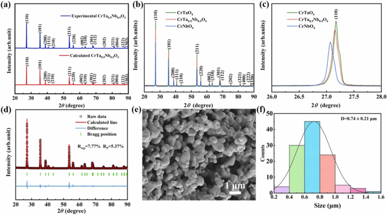 CrTaO4 and CrNbO4, rutile structured ternary scales formed on refractory high-entropy alloys (RHEAs), protect the RHEAs from oxidation and thermal attack. However, the Vickers hardness (12.20/10.20 GPa for CrTaO4 and CrNbO4, respectively) is lower than that of YSZ (14 GPa), making them prone to erosion. In addition, further reduction of thermal conductivity (1.31/1.09 W·m−1·K−1 for CrTaO4 and CrNbO4, respectively) benefits to protect the substrate materials from thermal attack. As such, optimizing their properties is urgently needed. To enhance the mechanical properties and further reduce the thermal conductivity of rutile-type ternary oxides CrTaO4 and CrNbO4, herein we designed a CrTa0.5Nb0.5O4 solid solution based on the mechanism of solid solution strengthening, and systematically investigated its phase composition, microstructure, mechanical and thermal properties. The HAADF and ABF-STEM analyses confirmed the rutile-structure of CrTa0.5Nb0.5O4, while minor impurities of rutile-structured CrNbO4 and CrO2 were also identified. The elastic modulus, bulk modulus, and shear modulus of CrTa0.5Nb0.5O4 are 201, 119, and 175 GPa, respectively. Notably, the mechanical properties of CrTa0.5Nb0.5O4 have been significantly improved via solid solution strengthening, with the Vickers hardness of 13.01 ± 0.2 GPa, fracture toughness of 2.07 ± 0.017 MPa·m1/2, and flexural strength of 201 ± 12 MPa. The measured melting point of CrTa0.5Nb0.5O4 is 2073±20 K, with an average thermal expansion coefficient of (5.91±0.52) × 10⁻6 K⁻1. The room-temperature thermal conductivity of CrTa0.5Nb0.5O4 is 1.07 W·m⁻1·K⁻1, which decreases to 0.57 W·m⁻1·K⁻1 at 1473 K, being lower than most of the well-known thermal barrier coating materials. In terms of thermal expansion coefficient matching, CrTa0.5Nb0.5O4 is a qualified thermal barrier material for refractory metals and their alloys and ultra-high temperature ceramics. Therefore, this study has not only successfully developed a thermal barrier coating material with excellent mechanical properties and low thermal conductivity, but also provided new ideas for the research and development of materials in high-temperature fields from the perspective of material design.