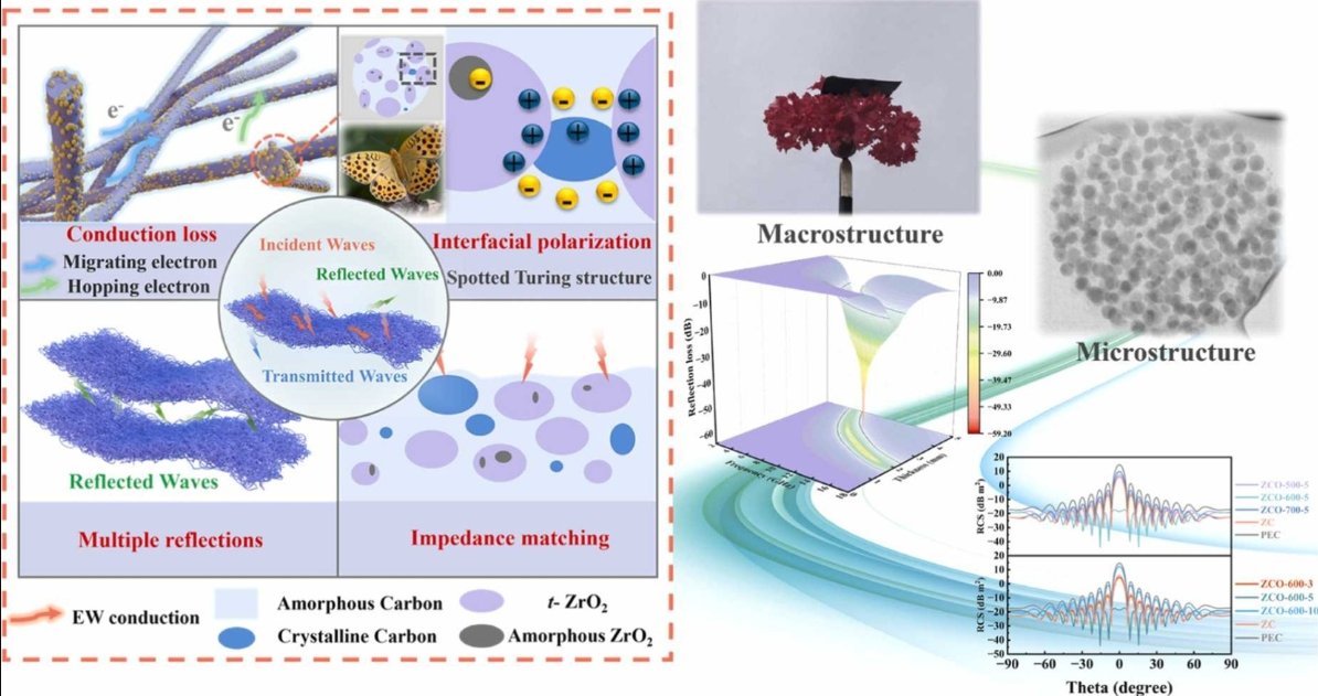 With the growing prominence of electromagnetic pollution, the development of lightweight, flexible, and highly efficient electromagnetic wave (EMW) absorption materials has become an important research focus. Inspired by biological Turing structures, this study successfully prepares novel flexible ZrO2/C nanofibers with a spotted reaction-diffusion pattern via a controlled oxidation strategy from preformed ZrC/C nanofibers. The ZrO2/C nanofibers sample contains ZrO2 particles embedded within a carbon matrix, which contributes to the formation of numerous heterogeneous interfaces. Furthermore, both the ZrO2 and carbon matrix exhibit a mixed amorphous-nanocrystalline structure, thereby enhancing interfacial diversity and density. The ZrO2/C Turing structural characteristic enhances impedance matching in the nanofibers and significantly improves the polarization loss capability. The obtained novel nanofibers achieve a minimum reflection loss of −59.20 dB, a maximum effective absorption bandwidth of 5.84 GHz, and require a matching thickness of only 2.39 mm. Computer simulation technology (CST) simulations indicate a maximum radar cross-section reduction of 34.94 dB m2, highlighting the material’ s radar stealth capability. The study provides a new strategy for designing lightweight and high-performance fiber-based EMW absorption materials.
