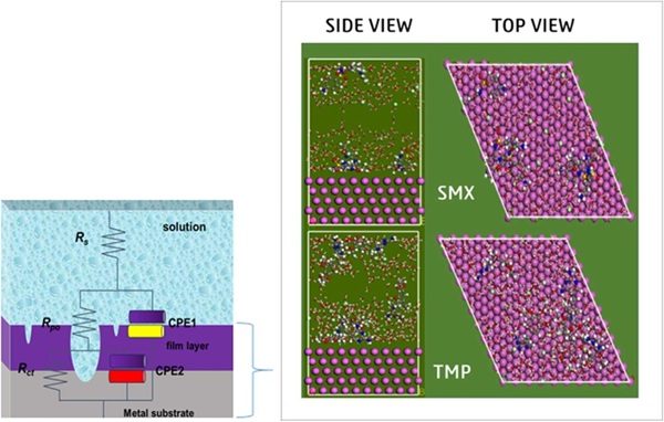 The mitigation of aluminum corrosion in HCl is crucial for economic, safety, and environmental considerations. The influence of Trimethoprim-Sulfamethoxazole (TMP-SMX) on the corrosion of aluminum in 1 M HCl was investigated through both electrochemical and computational methodologies. A notable difference in the open circuit potential values between the blank HCl and the inhibited system was recorded, indicating that TMP-SMX affects the electrochemical behavior of aluminum in 1 M HCl. The charge transfer resistance increased from 220 Ω cm2 without TMP-SMX to 610 Ω cm2 when 0.4 g/L of TMP-SMX was present, suggesting the establishment of a shielding TMP-SMX film on aluminium exterior. The current density exhibited a substantial decrease in the presence of TMP-SMX. The alteration in corrosion potential upon the incorporation of TMP-SMX remained below 85 mV, which suggests that TMP-SMX simultaneously retards anodic metal deterioration and cathodic hydrogen evolution. Computational simulation revealed that TMX and SMX maintain nearly parallel orientations with respect to the aluminum surface, suggesting enhanced surface coverage and interactions through heteroatoms and π-electron systems. ∆G⁰ values were negative, signifying that TMP/SMX spontaneously adhered to aluminum. Corrosion rate increased with rising temperature, but decreased with higher inhibitor concentrations. TMP-SMX has the potential to function as an environmentally friendly corrosion inhibitor for aluminium in HCl.