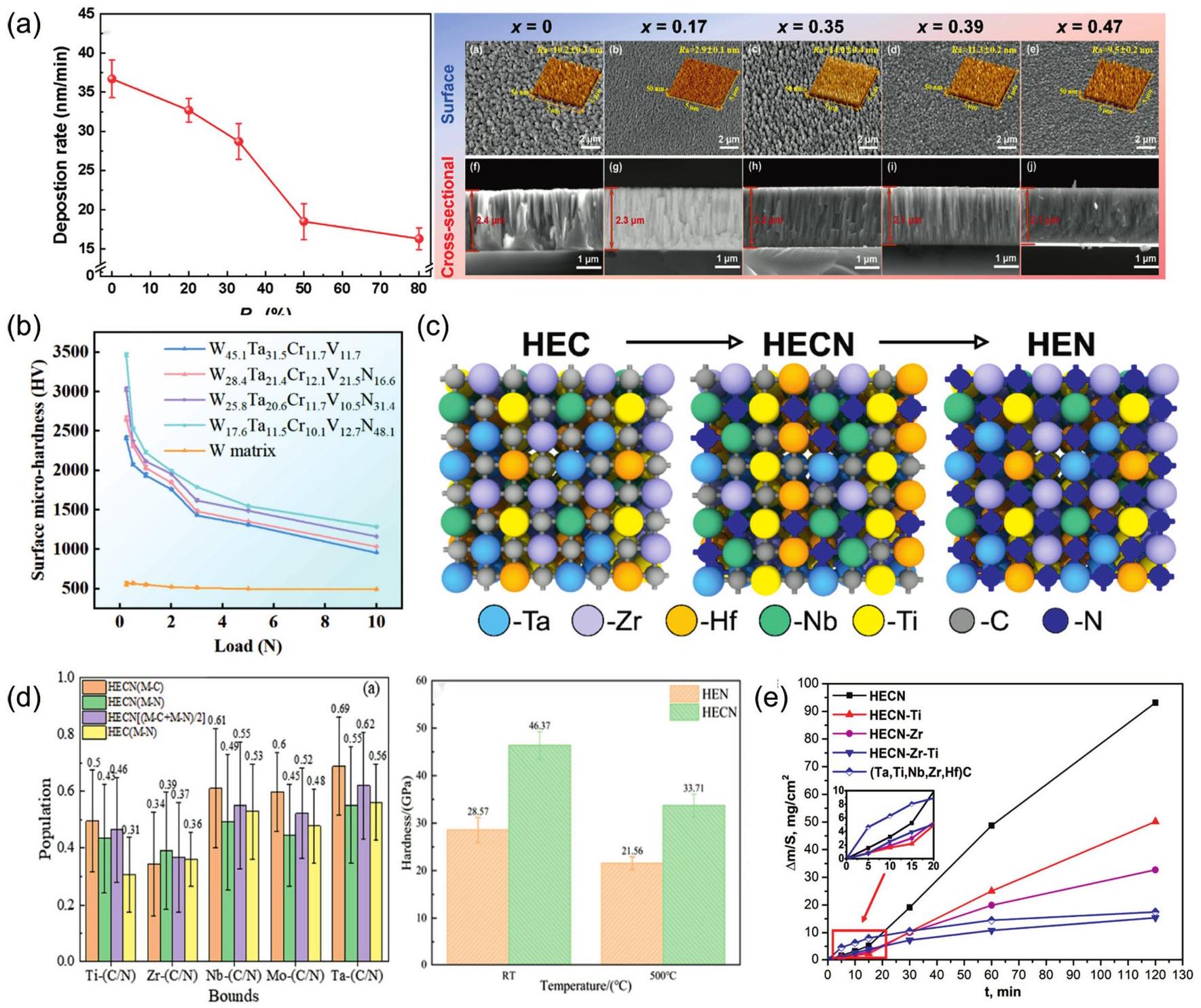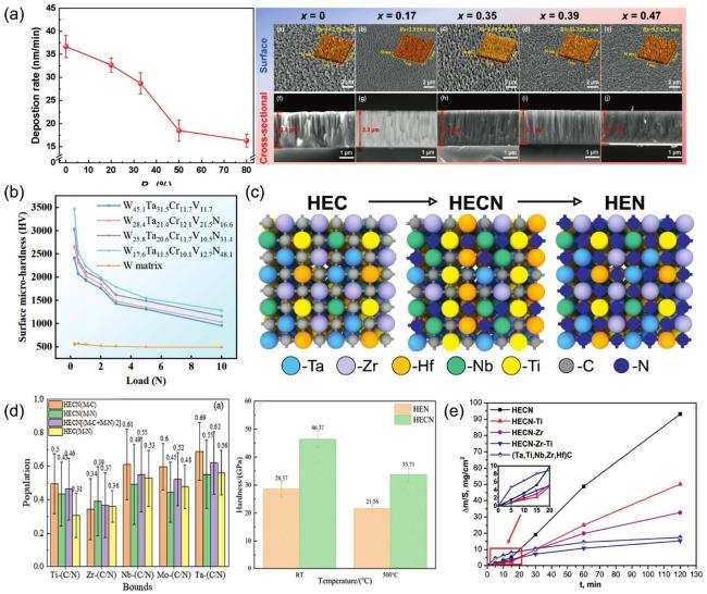 Fig. 10. (a) SEM images of surface and cross-sectional morphology of (MoNbTaTiZr) 1-x Nx coatings under different x; Deposition rates of (MoNbTaTiZr) 1-x Nx coatings with different RN. Reproduced from Ref [177]. Copyright Elsevier 2025. (b) Surface micro-hardness of W-Ta-Cr-V-N coatings. Reproduced from Ref [176]. Copyright Elsevier 2024. (c) Crystal Structures of HEC, HECN, and HEN. Reproduced from Ref [174]. Copyright Elsevier 2024. (d) Bond populations and density of states for HEN and HECN coatings; Crystal Structures of HEC, HECN, and HEN. Reproduced from Ref [179]. Copyright Elsevier 2024. (e) The increase in mass per unit area as a function of oxidation time reflects the variation of the surface mass of the sample with time at different oxidation durations. |