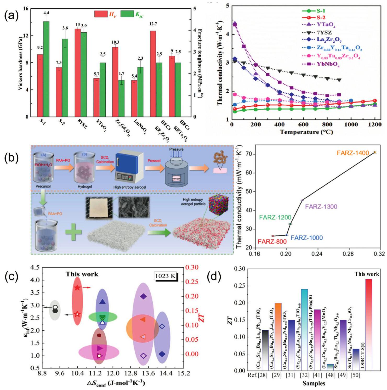 Fig. 13. (a) Mechanical property comparisons between dual-phase zirconate/tantalate HECs, 8YSZ, YTaO4, and others. Reproduced from Ref [204]. Copyright Elsevier 2024. (b) The fabrication process of (YErYbGdLa) 2Zr2O7 ceramic aerogel and its thermal insulating properties. Reproduced from Ref [52]. Copyright Elsevier 2024. (c) Comparison of PF (power factor) and ZT of ceramics with reported high-entropy perovskites at x=0.10. Reproduced from Ref [202]. Copyright Elsevier 2023. (d) Comparison of the ZT in this study with those of previously reported high-entropy perovskites. Reproduced from Ref [203]. Copyright Elsevier 2024. |