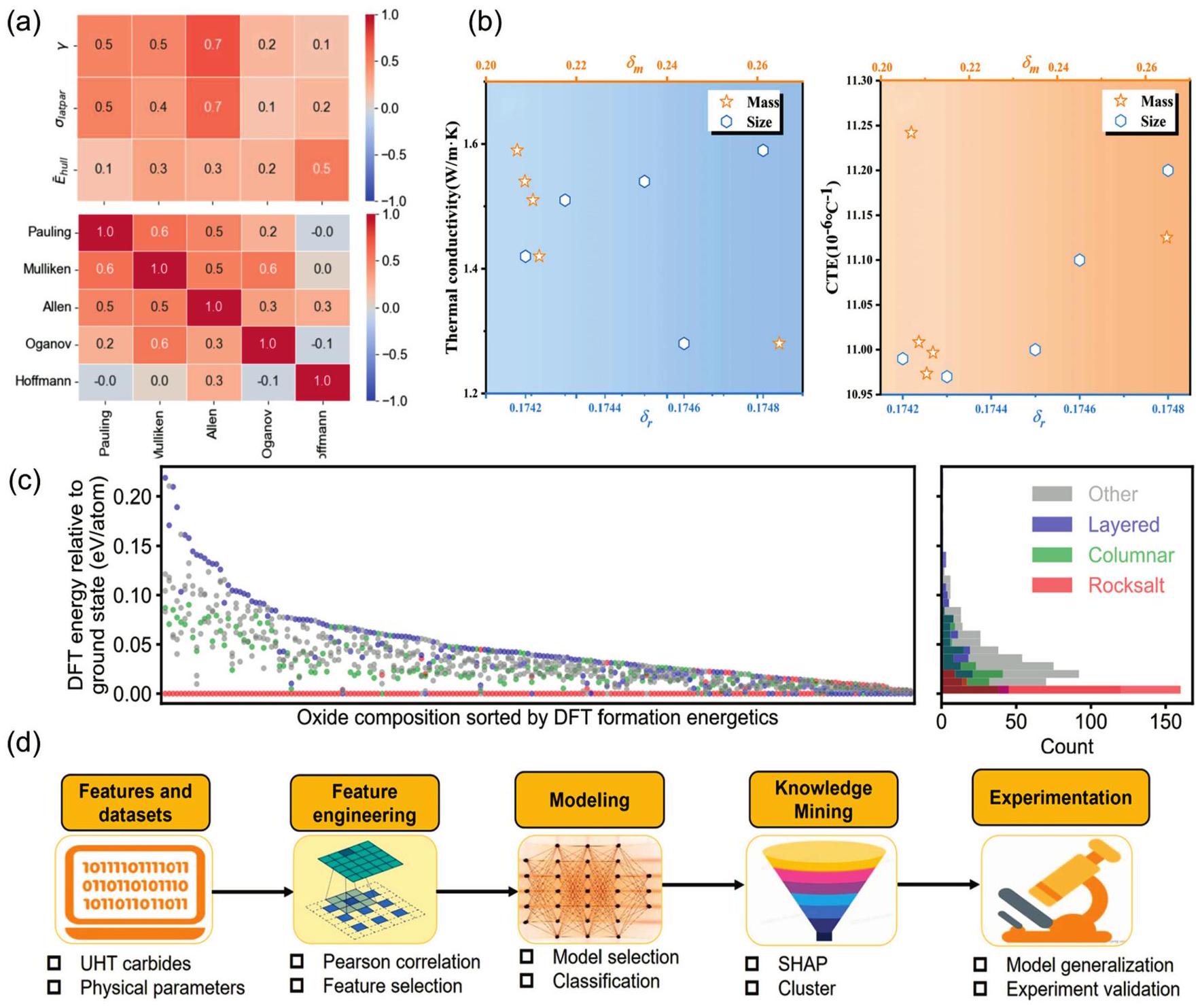 Fig. 2. (a) Pairwise correlations of computational parameters: atomic radius deviations, lattice parameters, stabilization factors for miscible binary carbides, and electrochemical factors on different scales (top); correlations between different electronegativity scales (bottom). Reproduced from Ref [64]. Copyright Elsevier 2024. (b) Atomic size difference and atomic mass difference vs. thermal conductivity (left) and thermal expansion coefficient (right) at |