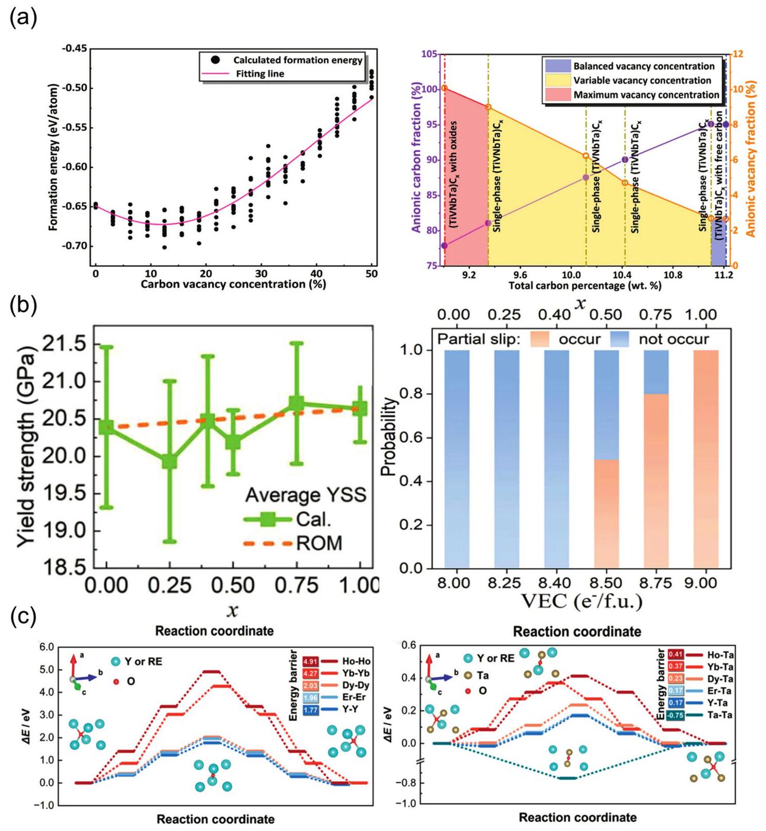 Fig. 4. (a) The fitting formation energy curve of (TiVNbTa)Cx with variation of anionic vacancy concentration; Curves of anionic carbon and vacancy fraction under changing carbon content. Reproduced from Ref [86]. Copyright Elsevier 2024. (b) Average YSSs and ROM (rule of mixture) predictions for (HfTiZr) |