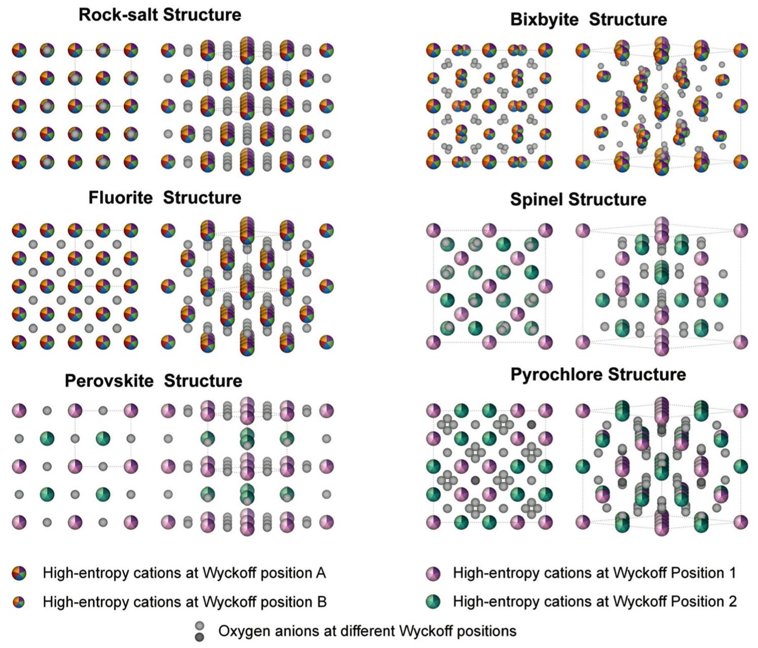 Fig. 5. Typical crystal structures of high-entropy ceramics. Here, two color schemes are used to clarify the difference between simple and complex oxides, and 2×2×2 supercells for the three crystal structures at left side for better comparison. |