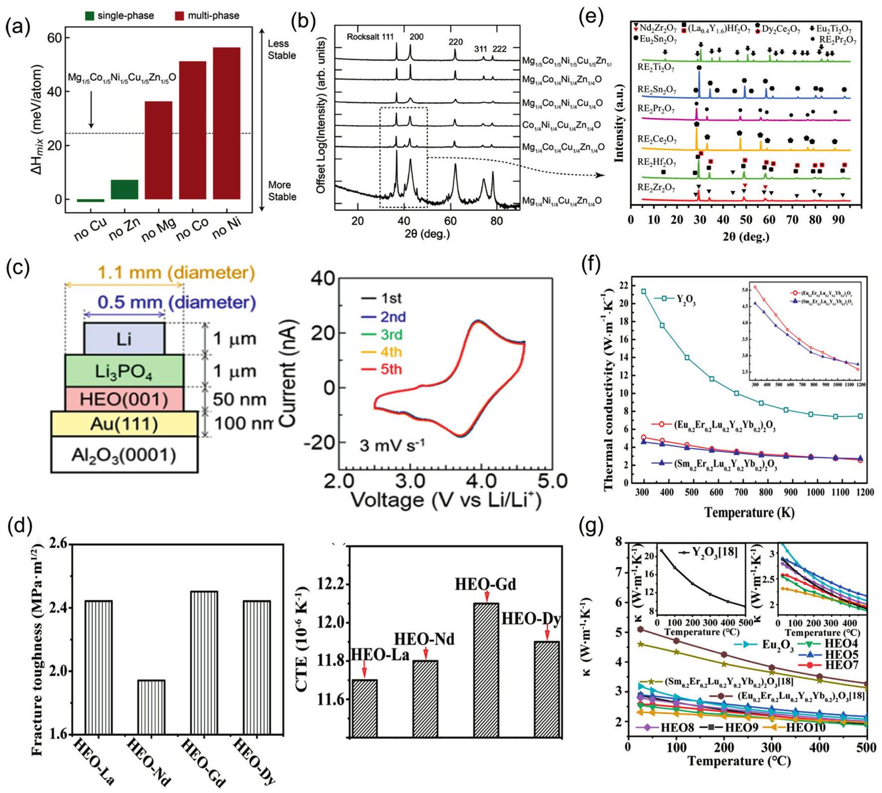 Fig. 6. (a) X-ray diffractograms of four-component derivatives of (MgCoNiCuZn)O as a substrate; (b) DFT analysis of four diffractive phase compositions by mixing enthalpy. Reproduced from Ref [94]. Copyright Elsevier 2024. (c) Side diagram of thin film battery with 50 nmLi(CrMnFeCoNiCu)2 (001) as positive electrode, and cyclic voltammogram. Reproduced from Ref [95]. Copyright American Chemical Society 2022. (d) CTE and Fracture toughness of HEO-La, Nd, Gd, Dy. Reproduced from Ref [97]. Copyright Elsevier 2024. (e) the XRD patterns of the samples. It can be seen that RE2Zr2O7 and RE2Hf2O7 failed to form single-phase high-entropy pyrochlore phase; RE2Ce2O7 and RE2Pr2O7HEOs, exhibited a single phase structure with a fluorite-type structure. Reproduced from Ref [99]. Copyright Elsevier 2025. (f) Calculation of thermal conductivity of (EuErLuYYb)2O3,(SmErLuYYb)2O3 and Y2O3. Reproduced from Ref [105]. Copyright Tsinghua University Press 2021. (g) Thermal conductivity |