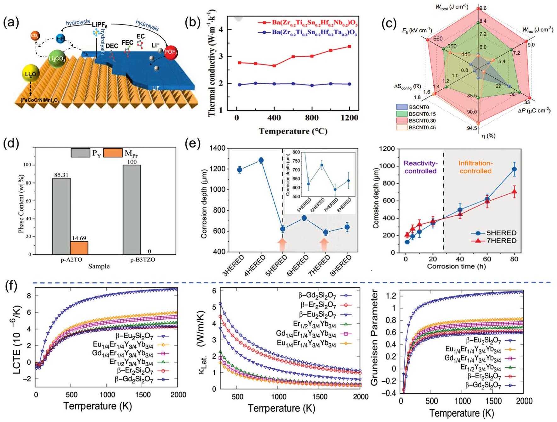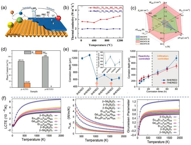 Fig. 7. (a) Schematic diagram representation of the conversion of Li2O,LiF, and Li2CO3 during the cycling process of the preconditioned HEOs. Reproduced from Ref [112]. Copyright Elsevier 2024. (b) Comparison of thermal properties at X=Ta,Nb. Reproduced from Ref [117]. Copyright The Royal Society of Chemistry 2024. (c) Effect of different configurational entropy (different x ) on energy storage performance. Reproduced from Ref [120]. (d) Effect of the introduction of Zr4+ on the content of the pyrochlore phase (PY) and monoclinic phase (MPr). Reproduced from Ref [137]. Copyright Elsevier 2023. (e) Corrosion depths of different component HEREDs at 1673 K,60 h; time-dependent curves of corrosion depths of 5HERED vs. 7HERED at 1673 K. Reproduced from Ref [121]. Copyright Elsevier 2024. (f) Thermal conductivity, CTE, and Grüneisen parameters as a function of temperature. Reproduced from Ref [140]. Copyright The Royal Society of Chemistry 2024. |
