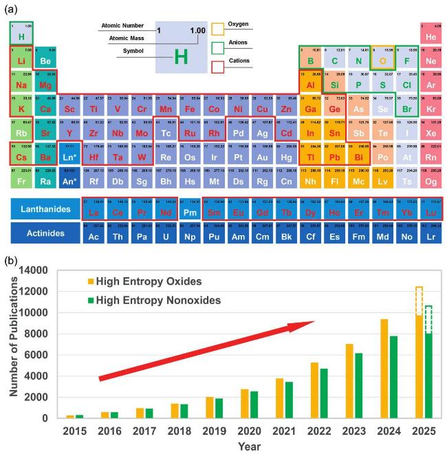 Fig. 1. (a) All the constituent elements reported in HECs to date. (b) Total number of publications on major HECs over the last decade. Data was retrieved from Web of Science on February 28, 2025, using keywords: "high-entropy", "oxide", "boride", "carbide", "nitride", "silicide", "fluoride", "hydride", "phosphide", "sulfide", and "ceramics". |