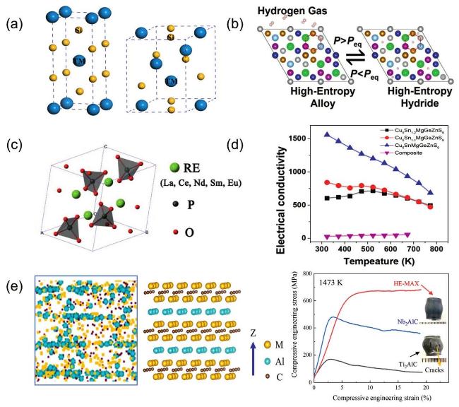 Fig. 11. (a) Crystal structure of tetragonal transition metal disilicide (left), hexagonal transition metal disilicides (right). Reproduced from Ref [196]. Copyright Elsevier 2023. (b) Reversible phase transitions of HEA and HEH during hydrogen absorption. Reproduced from Ref [190]. Copyright Elsevier 2024. (c) Crystal structure of HEPO4 monazites. Reproduced from Ref [191]. Copyright Elsevier 2019. (d) Electrical conductivity of the high-entropy sulfides. Reproduced from Ref [192]. Copyright American Chemical Society 2018. (e) A tomogram slices of the HE-MAX phase lattice structure as well as a picture of the crystal structure in the ideal case; Compressive stressstrain curves of the HE-MAX, Nb2AlC, and Ti2AlC at 1473 K, insets show the specimens after testing is completed. Reproduced from Ref [151]. Copyright Elsevier 2024. |