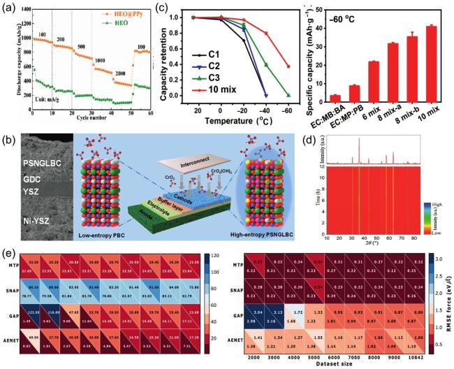 Fig. 14. (a) The rate discharge performance of HEO and HEO@PPy at various current densities; the rate performance of HEO@PPy significantly outperforms that of HEO. Reproduced from Ref [224]. Copyright Elsevier 2024. (b) Schematic and SEM cross-section of a single cell with (PrSmNdGdLa)BaCo |