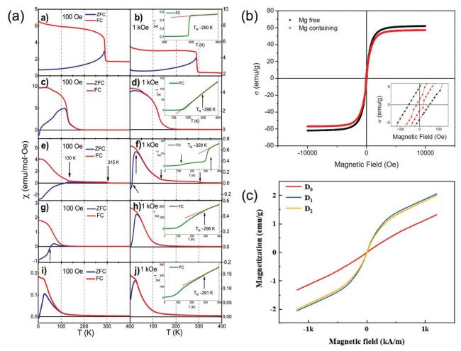 Fig. 16. (a) Magnetic induction strength versus temperature for (a-b) LC, (c-d) LCM, (e-f) LCMF, (g-h) LCMFA, and (i-j) LCMFAG ceramics in ZFC (Zero Field Cooling) and FC (Field Cooling) modes at 100 Oe and 1000 Oe, inset show the |