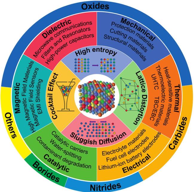 Fig. 18. An overview diagram of HECs. The outer ring shows the percentage of studies on high-entropy oxides, carbides, nitrides, borides and others. The inner rings show the main applications of HECs, as well as the four core effects of high-entropy materials and a schematic of the disordered structure, respectively. |