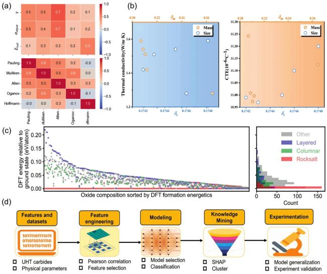 et al. [67] used EFA to relate the thermal insulation properties to atomic size and mass differences to rationalize the composition of highentropy fluorite oxides (Fig. 2(b)). Further advancing this field, Peng et al. [60] established a physics-inspired descriptor based on firstness principle for predicting the degree of cation ordering in multicomponent perovskite oxides and verified that it has up to 93% accurate ordering rate in 190 experimental samples, which significantly improves the prediction of experimental ordering by machine learning and theoretical models. (Fig. 2(c)).