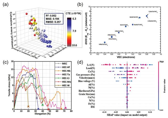 Fig. 3. (a) The 3D plots of the NET (neural network) training set were generated based on three parameters (bulk modulus, Young's modulus, and cohesive energy). Reproduced from Ref [79]. Copyright Elsevier 2024. (b) A plot of (iDOS( Epg,EF )) vs. VEC composed of nine solid solution high-entropy carbides shows that iDOS increases linearly along with VEC, and Pearson's correlation coefficient was 0.99. Reproduced from Ref [82]. Copyright Elsevier 2024. (c) The stress-strain curves from the AIMD (Ab Initio Molecular Dynamics) tensile simulations of MEC and HEC. Reproduced from Ref [77]. Copyright Elsevier 2024. (d) SHAP (Shapley Additive exPlanations) visualization features importance ranking. Reproduced from Ref [84]. Copyright Elsevier 2024. |