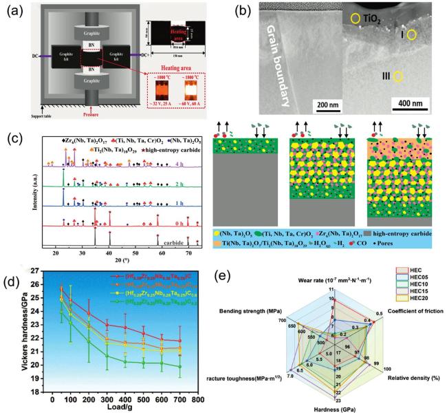 Fig. 8. (a) Schematic diagram of ultra-fast pressure sintering apparatus. Reproduced from Ref [149]. Copyright Elsevier 2025. (b) TEM cross-sections of the two samples sintered by SPS and SLS respectively, the sample with SPS has a uniform morphology and the sample sintered by SLS has a three-layer structure. Reproduced from Ref [148]. Copyright American Ceramic Society 2024. (c) XRD patterns of the samples oxidized for different durations, and Ti2(Nb,Ta)10O29 appeared at 4 h ; The schematic diagram of the oxidation mechanism of (TiZrNbTaCr)C in steam at |