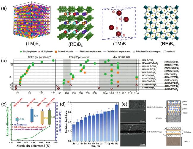 Fig. 9. (a) Crystal structures of different HEBs. Reproduced from Ref [167,170-172]. Copyright Elsevier 2021. (b) Prediction of multiple HEB2 syntheses by DEED: Compared with the results of EFA and VEC, the prediction of DEED was significantly better than the other two. Reproduced from Ref [10]. Copyright The Nature Publishing Group 2024. (c) Correlation between hardness, lattice distortion, and Atomic-size difference |