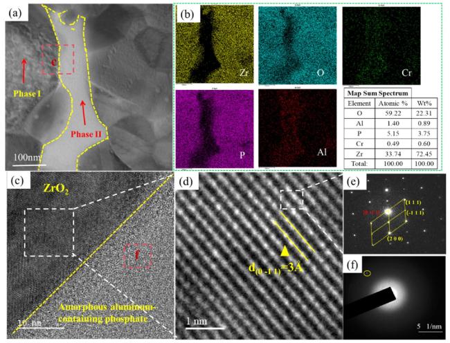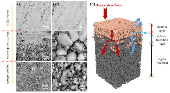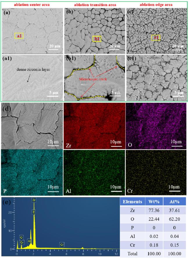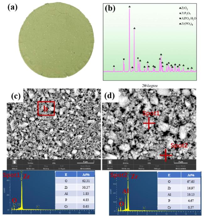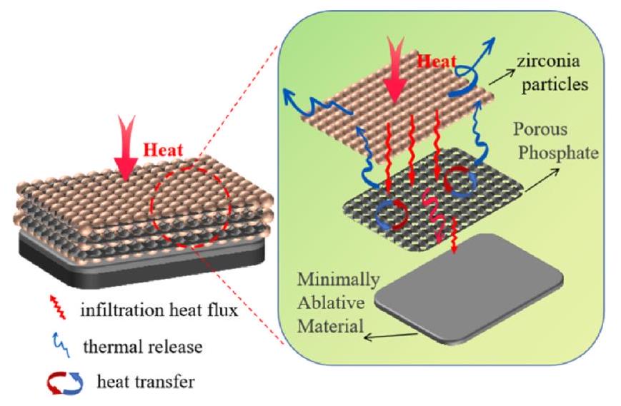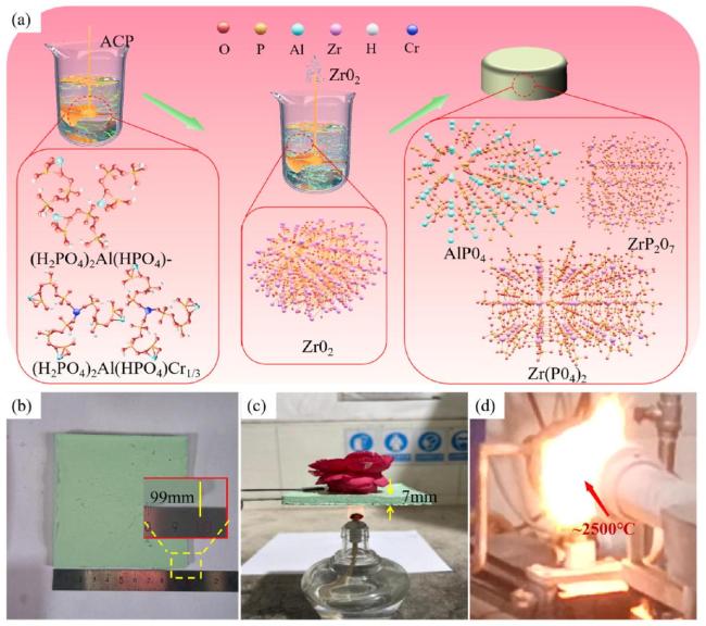 The development of new ablation-resistant and heat-insulating integrated materials for thermal protection of hypersonic vehicles is extremely important, but significant challenges remain. In this study, zirconium-based phosphate ceramics were developed by mixing a nano powder of the traditional ultra-high temperature ceramic oxidation product ZrO2, which has excellent thermal insulation performance, with an aluminum–chromium phosphate slurry, which provides a certain degree of thermal stability. The zirconium-based phosphate ceramics crosslinked and cured by a polycondensation reaction inherited the high temperature resistance of ZrO2 and the low thermal conductivity of the phosphate material, and simultaneously achieving excellent thermal stability, mechanical properties, and the desired properties. The mass ablation rate and line ablation rate of the zirconium-based phosphate ceramics were found to be 0.0173 g/s and 0.0114 mm/s, respectively, under oxyacetylene flame ablation at 2527°C for 30 s. In addition, cooling by up to 2301℃ was achieved over a distance of 10 mm in the thickness direction was achieved. The zirconium-based phosphate ceramics also exhibited remarkable compressive strength (6.23–29.22 MPa), good thermal insulation (0.827–1.784 W/m·K), excellent thermal stability, and mass loss within 2.2% in thermogravimetric tests from room temperature to 1400 ℃. These properties indicate that zirconium-based phosphate ceramics can be utilized in thermal protection systems in hypersonic vehicles, rocket propulsion, and missile launchers.