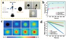 (a) Schematic illustration and photographs of MBene membrane and nylon membrane. (b) The temporal variation of the surface temperature, (c) Infrared thermal figures of MBene membrane, (d) The temporal variation of water mass change of the three evaporation models under 1 sun irradiation.