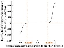 Distribution of the electric field component perpendicular to the fiber direction between electrodes for D33-type FPC (the horizontal axis representing the normalized coordinate parallel to the electric field direction, i.e., the ratio of the distance from the observation point to the electrode centerline to the electrode spacing).