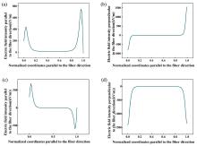 (a) Electric field intensity parallel to the fiber direction for D33-Type FPC; (b) Electric field intensity perpendicular to the fiber direction for D33-Type FPC; (c) Electric field intensity parallel to the fiber direction for D31-Type FPC; (d) Electric field intensity perpendicular to the fiber direction for D31-Type FPC.