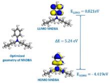 Optimized geometry of NNDBA with HOMO and LUMO distributions and their corresponding energy levels.