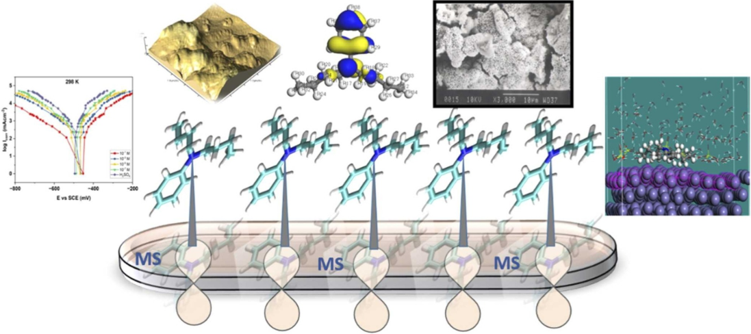 This study explored the prevention of mild steel (MS) corrosion in sulfuric acid through deployment of N, Ndibutylaniline (NNDBA) as an organic inhibitor. The inhibition efficacy was meticulously scrutinized using a blend of qualitative and quantitative methodologies. The gravimetric method was executed across a spectrum of NNDBA concentrations (10-1M-10-7M ) and temperatures, 298 K-328 K (with 10 K increments), facilitating an intricate kinetic and thermodynamic exploration of the inhibition mechanism. Adsorption isotherm analyses affirmed NNDBA's adherence to Langmuir's model, signifying a monolayer adsorption paradigm. The adsorption process was found to be spontaneous and thermodynamically favorable, predominantly governed by physisorption. Empirical data delineated an inverse relationship between temperature and inhibition efficiency, whereas an augmentation in NNDBA concentration bolstered corrosion resistance. Potentiodynamic Polarisation (PDP) confirmed that NNDBA is a mixed-type inhibitor with a maximum efficiency of 92.4%. Electrochemical Impedance Spectroscopy (EIS) measurements revealed a marked decrement in the double-layer capacitance at the Fe/H2SO4 interface, corroborating inhibitor adsorption. Notably, the lower value of the phase shift exponent n for NNDBA suggests increased surface heterogeneity due to inhibitor film formation. Scanning Electron Microscopy (SEM-2D) and Atomic Force Microscopy (AFM-3D) unveiled distinct morphological alterations indicative of surface passivation. Density functional theory (DFT) calculations provided insights into the electronic structure of NNDBA, revealing a highly negative EHOMO , low ELUMO , and a small ΔE(5.24eV), all suggesting strong reactivity and the formation of a stable metal-inhibitor complex. The mechanistic pathway and spatial orientation of the interaction between the NNDBA molecule and MS surface were explored through molecular dynamics simulation to gain insights into its inhibitory behavior. Thus, the theoretical insights harmonize with experimental findings, substantiating its efficacy as a potent corrosion mitigant.